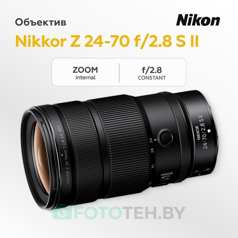 - Nikon Nikkor Z 24-70mm f/2.8 S II — универсальный профессиональный объектив для задач, где важны скорость, гибкость и качество изображения.Nikon Nikkor Z 24-70mm f/2.8 S II — это объектив для тех, кому нужен надежный универсальный инструмент для повседневной профессиональной съемки. Диапазон 24-70 мм считается одним из самых практичных, потому что позволяет уверенно работать с репортажем, портретом, предметной съемкой, интервью, событиями и коммерческим контентом без постоянной смены оптики.Постоянная светосила f/2.8 делает объектив удобным для работы в самых разных условиях и помогает сохранять предсказуемый результат во всем диапазоне фокусных расстояний. Такая модель хорошо подходит для фото и видео, для студийной работы, корпоративной съемки, контента для сайта, социальных сетей, презентаций и рекламных материалов.Это тот тип объектива, который часто становится основным в рабочем комплекте. Он удобен для специалистов, которым нужен один сильный зум на каждый день, без узкой привязки к какому-то одному жанру съемки.Для кого подойдетNikon Nikkor Z 24-70mm f/2.8 S II подойдет фотографам, видеографам, студиям, маркетинговым отделам, продакшн-командам и компаниям, которым нужен универсальный профессиональный объектив. Эта модель особенно хорошо вписывается в задачи репортажной, портретной, предметной, событийной, контентной и корпоративной съемки, где важно быстро адаптироваться к разным сценам и получать стабильный результат.Основные характеристики